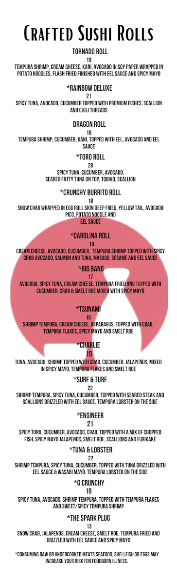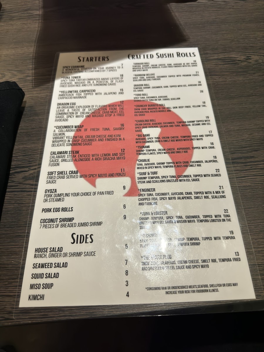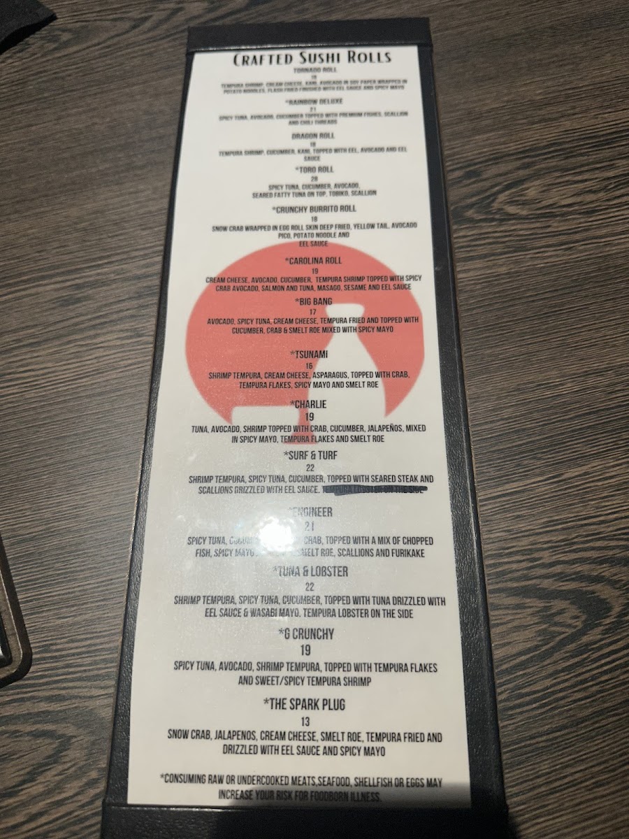 The selection includes both classic and inventive sushi rolls like the Tornado Roll and Carolina Roll, alongside hearty hibachi dinners featuring tender filet and fresh scallops. Lighter bites such as spicy edamame and coconut shrimp complement the range, while small plates like Chicken Katsuo and Korean-style short ribs invite a communal dining experience. House-made soups and rich dishes like bone marrow and duck breast offer comforting moments throughout the meal.